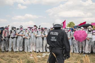 My photograph of climate activists of the Germany-based collective Ende Gelände in a standoff with police during an occupation of a cargo railway near the port of Hamburg as part of a mass action meant to shutdown fossil fuel transportation infrastructure in and around the port.