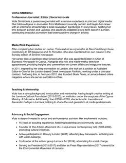 YIOTA DIMITRIOU Professional Journalist | Editor | Social Advocate Yiota Dimitriou is a passionate journalist with extensive experience in print and digital media. She holds a degree in Journalism from Middlesex University London and began her career with an internship at Cambridge’s local newspaper, Cambridge Evening News. Splitting her time between London and Larnaca, she aspires to establish a long-term career in London, contributing impactful journalism that fosters positive change in society. Media Work Experience After completing her studies in London, Yiota worked as a journalist at Dias Publishing House, contributing to OK Magazine and To Periodiko. She also maintained her own column in the Sunday edition of Simerini newspaper. Her career took a significant step forward when she was appointed Editor-in-Chief of Espresso Newspaper in Cyprus. Alongside this role, she made weekly television appearances, providing insights and commentary on current affairs and magazine features. In 2011, inspired by her deep connection to London, she took on a position as Assistant Editor-in-Chief at the London-based Greek newspaper Parikiaki, working under a one-year contract. Following this, in February 2012, she founded Skala Times, a Larnaca-based online magazine where she serves as Editor-in-Chief. Teaching & Mentorship Yiota has a strong background in education and mentorship, having taught creative writing at the Larnaca Cultural Foundation (2015-2020), an institution under the auspices of the Cyprus Ministry of Education. Additionally, from 2018 to 2020, she lectured in Journalism at Alexander College in Larnaca, helping to shape the next generation of media professionals. Social Engagement Yiota is deeply invested in social and environmental activism. Literary Contributions Yiota is also a published poet. Her debut poetry collection was presented in Larnaca by actress Elena Hadjiafxenti in 2015